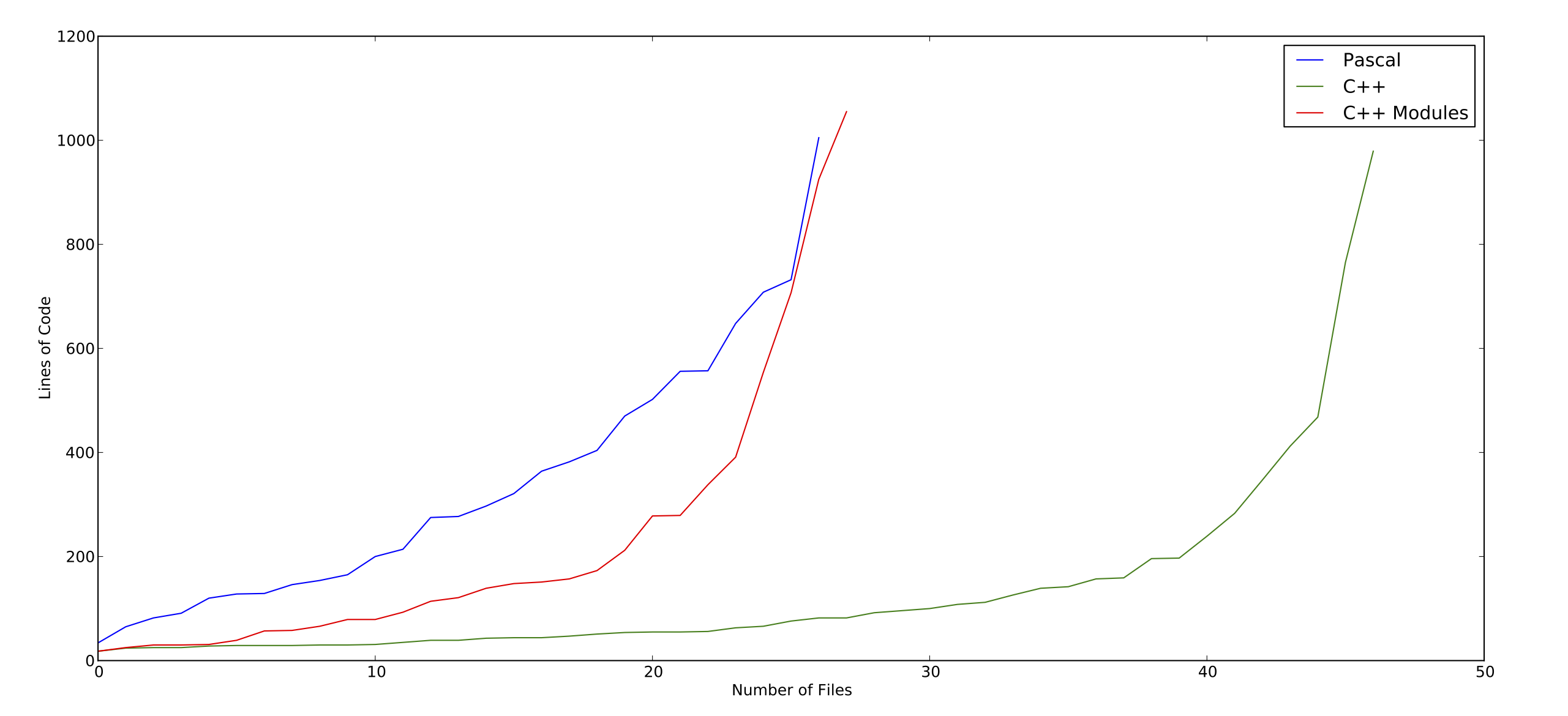 Here is a graph comparing the two projects by line of code. Note that the “C++ Modules” line is another way of organizing the same code as in “C++ Files”, treating each header and code file as a module.