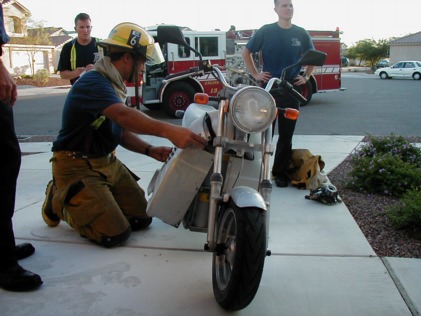 I ran inside, where my wife, two of her friends, and all of their kids were visiting in the living room. “My motorcycle’s on fire!” I shouted. “All you kids stay inside!” my wife ordered. “The fire extinguisher’s under the counter!” (She’s quick.)