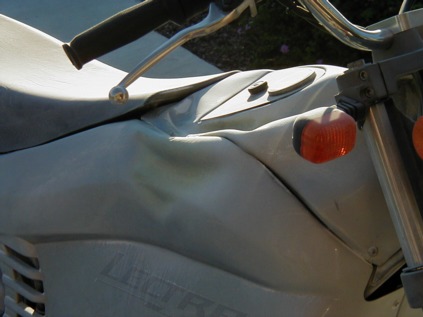 But on the night of September 13, Friday the 13th, in fact, on my ride home, as I was about a mile from my house, I smelled the smell quite strongly at a stoplight. “I’m going to have to take the faring off completely and find that smell tonight,” I thought. “No way that’s from the brake assembly.” I still thought that what I would find would simply be some browning insulation. I was also wondering about how I might be able to elicit the smell at home, since it would fade quickly at the end of a ride.