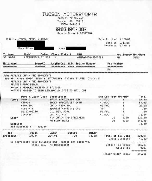 And so, on Valentine’s Day, at about 10 o’clock in the morning, I stopped into Tucson Motorsports again. This time I happened to run into a salesman who was intrigued enough by the Lectra and by my problem (my custom rear sprocket) to go a little further. As he was leading me back to the service bay, he called out, “Get Bob Vila!”