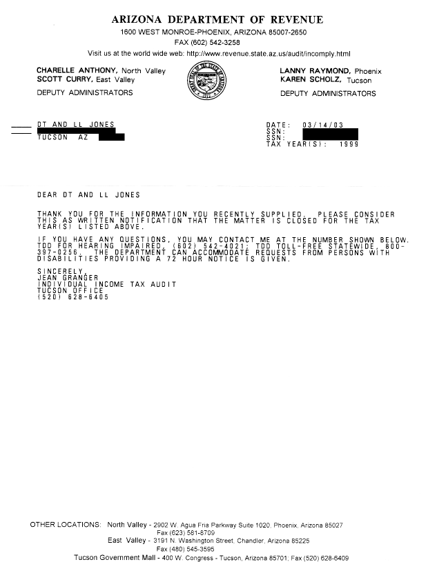 Thank you for the information you recently supplied. Please consider this as written notification that the matter is closed for the tax year(s) listed above [1999].